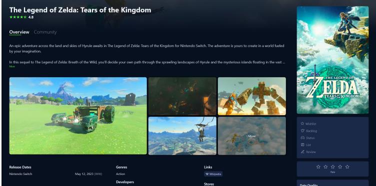Desde la página de Explore, encuentre un juego específico o vea las tendencias y los juegos recientemente lanzados. Cada página del juego presenta información como fecha de lanzamiento y género, capturas de pantalla y la capacidad de agregar una revisión.