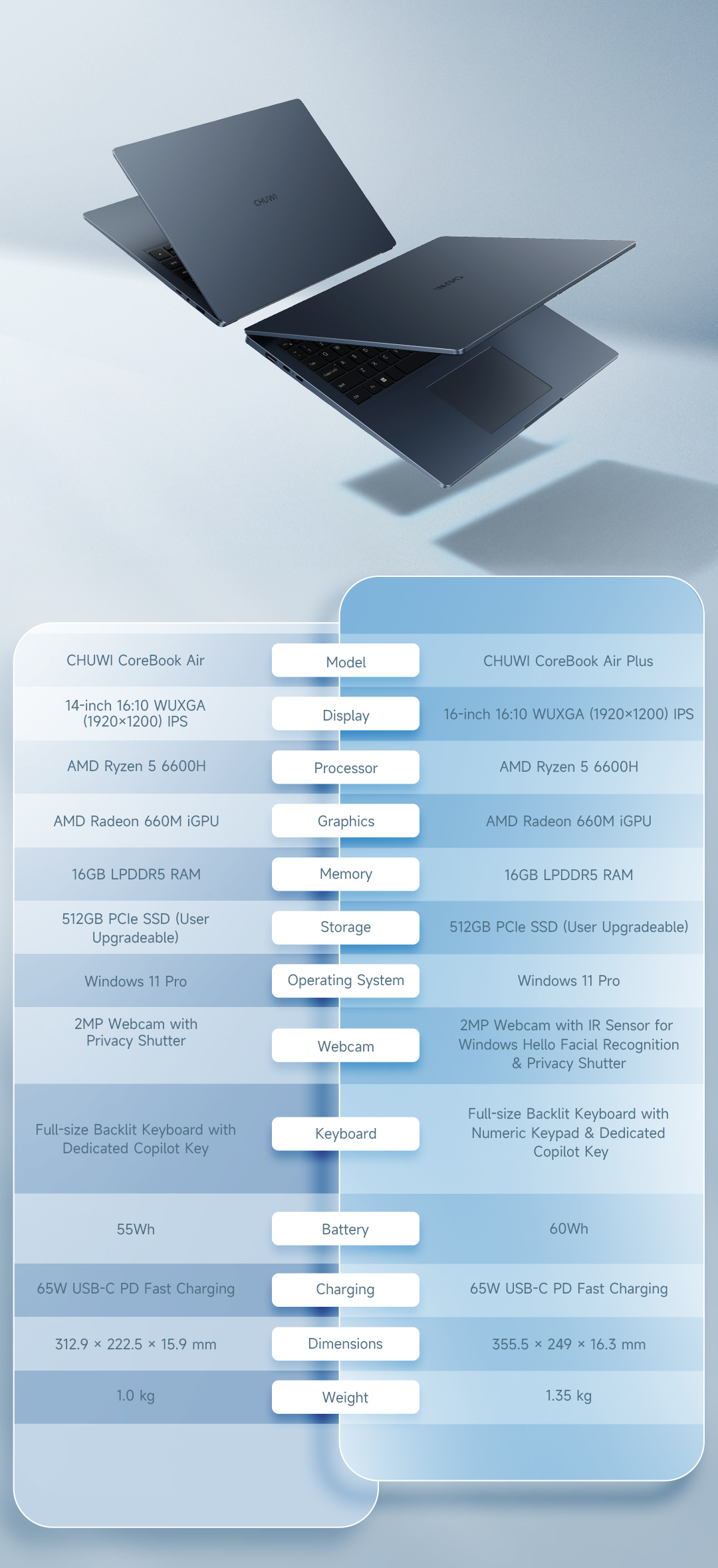 Las laptops ligeras ya no son solo una tendencia: se están convirtiendo en el futuro de la informática personal. En 2026, los dispositivos que llevamos deben ser rápidos, compatibles con IA y lo suficientemente potentes como para realizar tareas reales, pero a la vez lo suficientemente ligeros como para caber en una mochila. Ahí es precisamente donde entra en juego la nueva serie CoreBook Air de CHUWI. Con el CoreBook Air (14") de 1 kg y el ultrafino CoreBook Air Plus (16") , CHUWI lleva el diseño ultraportátil más allá que nunca, ofreciendo una calidad de construcción premium, una batería de larga duración y modernas funciones de IA a precios muy inferiores a los de las marcas convencionales. Estos nuevos modelos no son solo portátiles más ligeros, sino una forma más inteligente y accesible de actualizarse antes de la llegada de la próxima ola de experiencias Windows con IA.