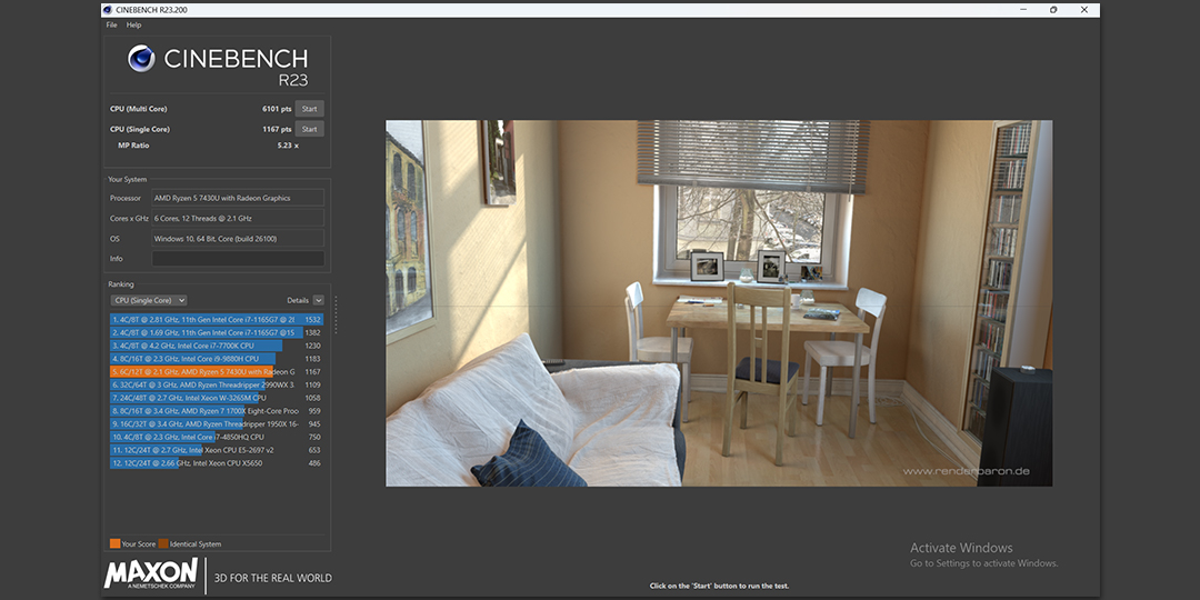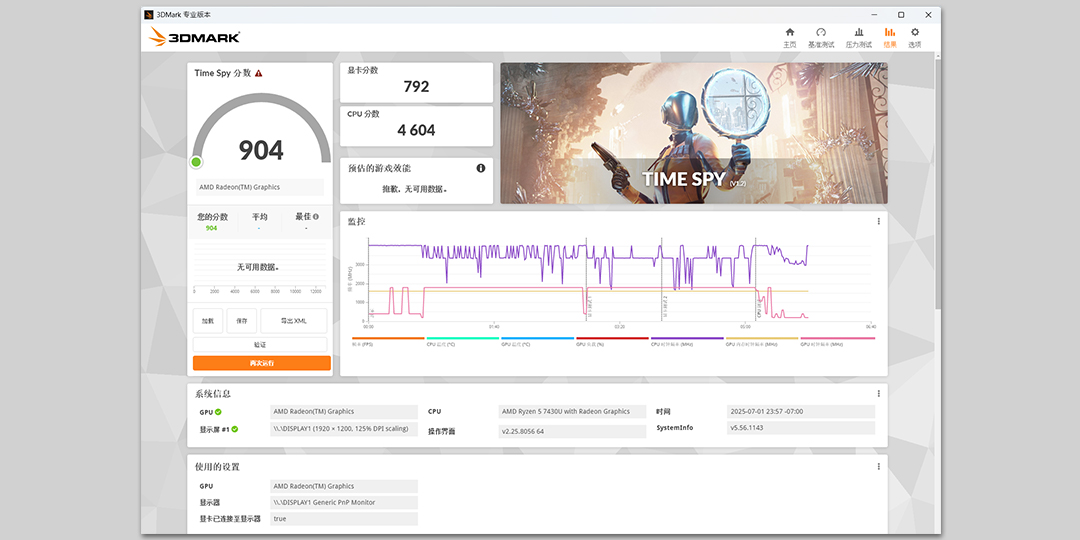 Cinebench 2023 テストでは、CPU はシングルコアスコア 1167、マルチコアスコア 6101 を獲得しました。3DMark Time Spy テストでは、スコア 904 を獲得しました。