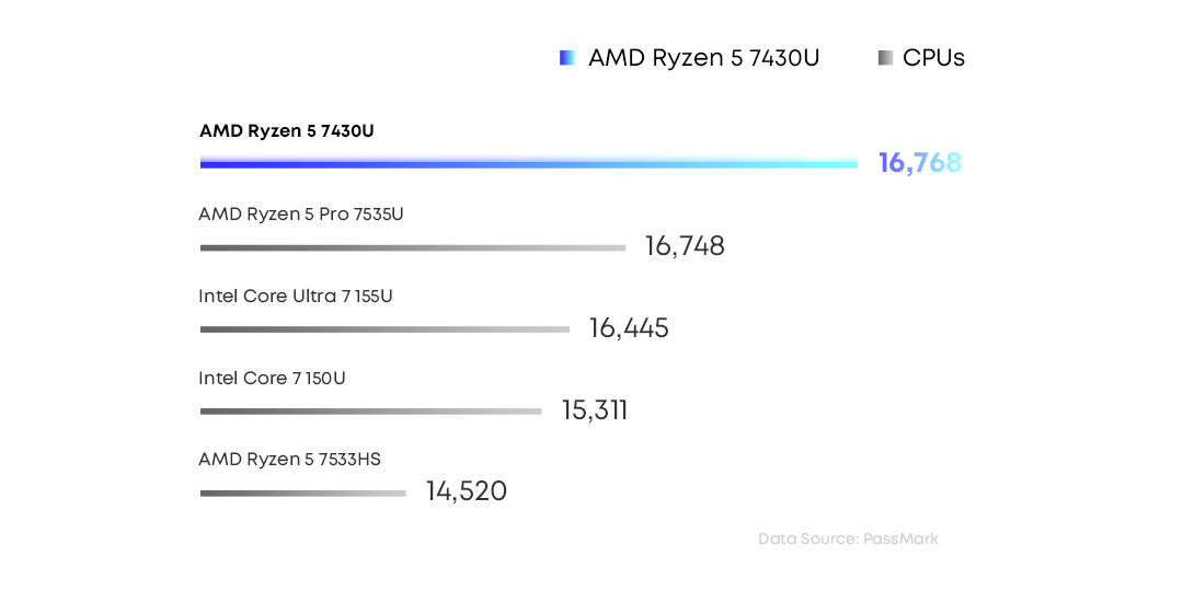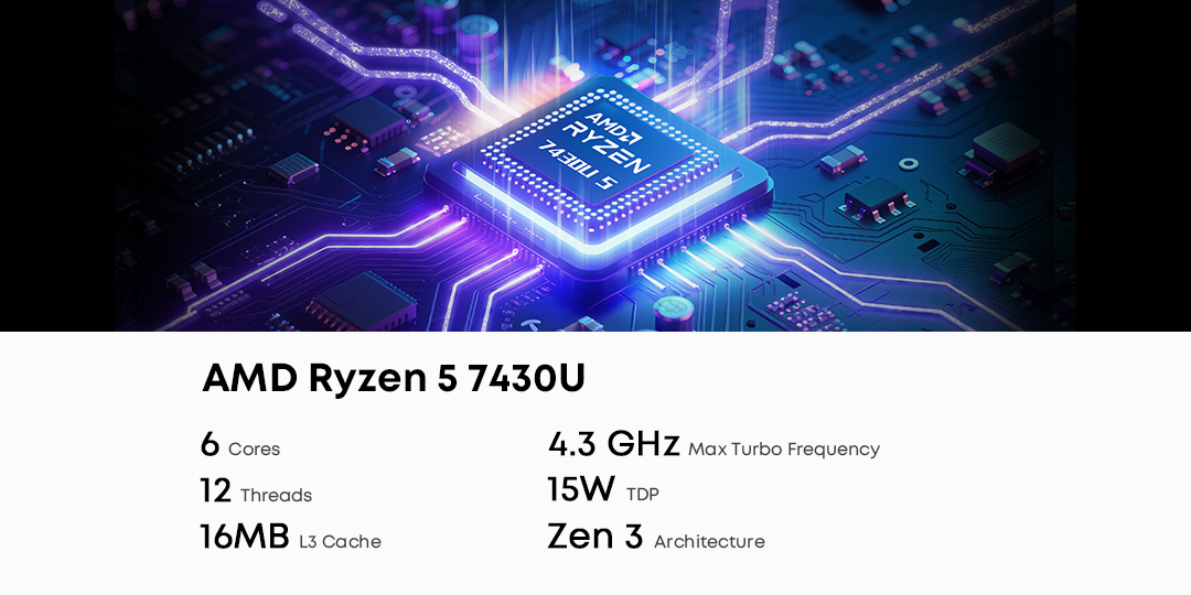 CoreBook Plusの心臓部には、先進のZen 3アーキテクチャを採用したAMD Ryzen 5 7430Uが搭載されています。6コア12スレッド、最大4.3GHzのターボ周波数を誇り、ゲームやストリーミングから編集や開発まで、あらゆるマルチタスク処理において卓越したパワーを発揮します。